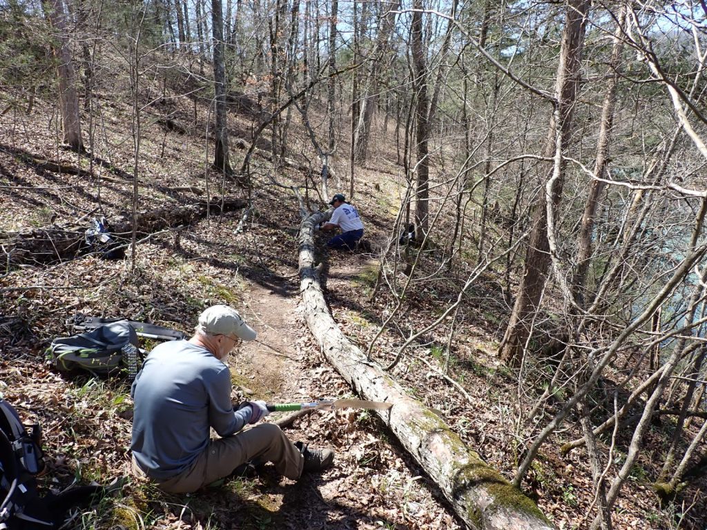 We had 7 volunteers contribute 225 volunteer hours while clearing almost all major obstacles from 23 miles of the BRT between Steel Creek and Pruitt. We left 2 large trees that must be crawled under and 2 that must be detoured around. Everything else was removed or at least reduced to an easy step-over. We never had more than 4 people on the trail over our 5.5 working days so I think it was a pretty amazing accomplishment. We were aided by the addition of a couple new 21″ saws to our arsenal.